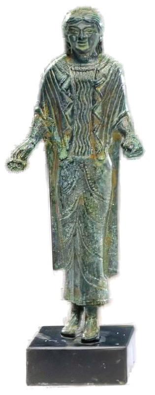 Darstellung einer jungen Frau im Opferritus: in ihrer rechten Hand hält sie eine Blume, in der linken einen Granatapfel. Gefunden wurde die Statuette aus dem 5. Jh. v. Chr. im etruskischen Heiligtum von Monteacuto Ragazza in der Provinz Bologna. Zu bewundern ist die Dame im Museo Civico Archeologico in Bologna.