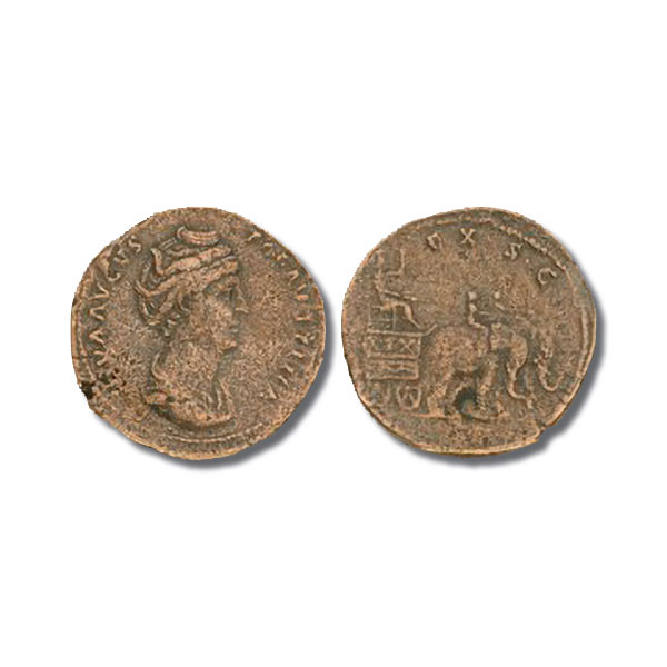 Rückseite: Faustina sitzend auf einem Carpentum (vierrädrigem Wagen), eine Fackel haltend, gezogen von zwei Elefanten mit Reitern. Darüber die Buchstaben EX SC = ex senatus consulto, dh. die Münze wurde auf Beschluss des römischen Senats geprägt.